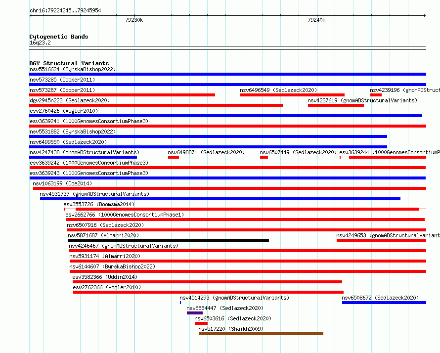 Variant DetailsVariant: esv3639242| Internal ID | 7026025 | | Landmark | | | Location Information | | | Cytoband | 16q23.2 | | Allele length | | Assembly | Allele length | | hg38 | 21710 | | hg19 | 21710 |