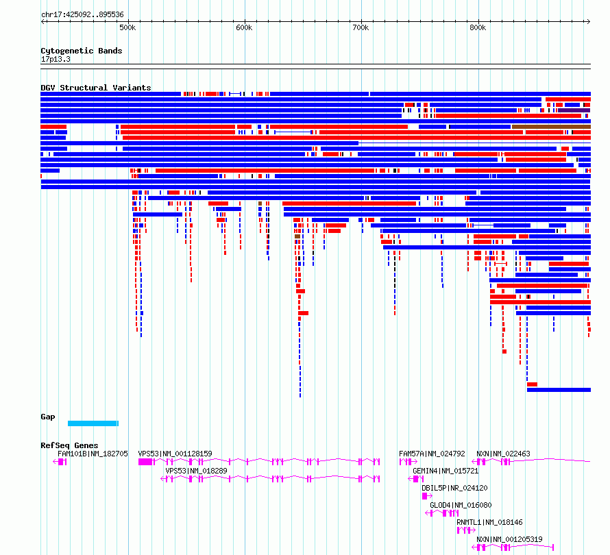 Variant DetailsVariant: esv3639625| Internal ID | 6679716 | | Landmark | | | Location Information | | | Cytoband | 17p13.3 | | Allele length | | Assembly | Allele length | | hg38 | 470445 | | hg19 | 523894 |