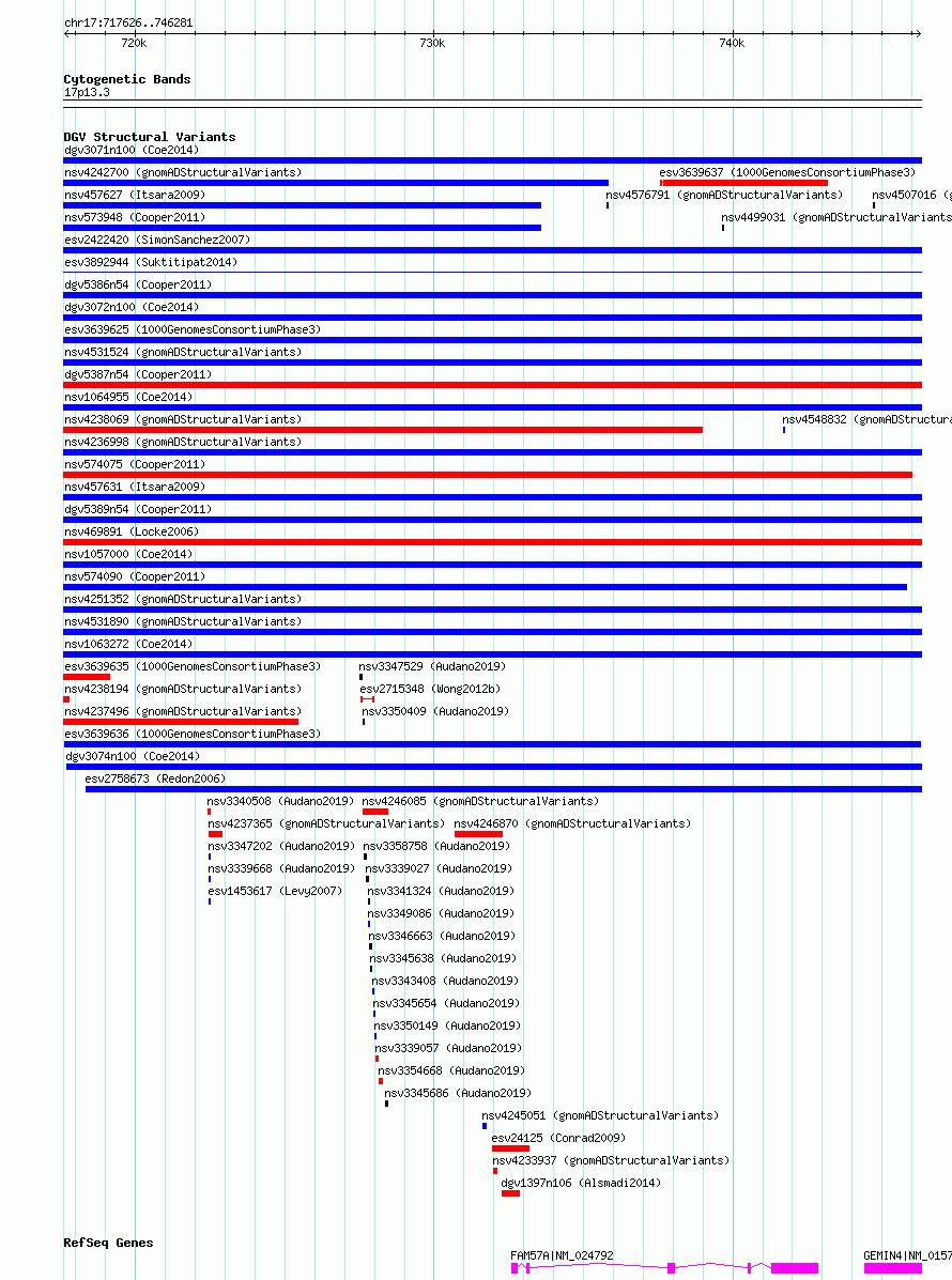 Variant DetailsVariant: esv3639636| Internal ID | 6679727 | | Landmark | | | Location Information | | | Cytoband | 17p13.3 | | Allele length | | Assembly | Allele length | | hg38 | 28656 | | hg19 | 28656 |
