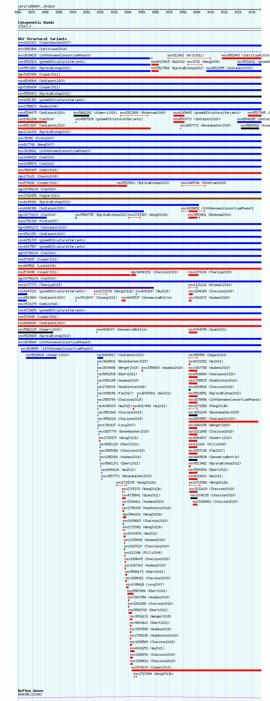 Variant DetailsVariant: esv3639649| Internal ID | 7026427 | | Landmark | | | Location Information | | | Cytoband | 17p13.3 | | Allele length | | Assembly | Allele length | | hg38 | 17624 | | hg19 | 17624 |
