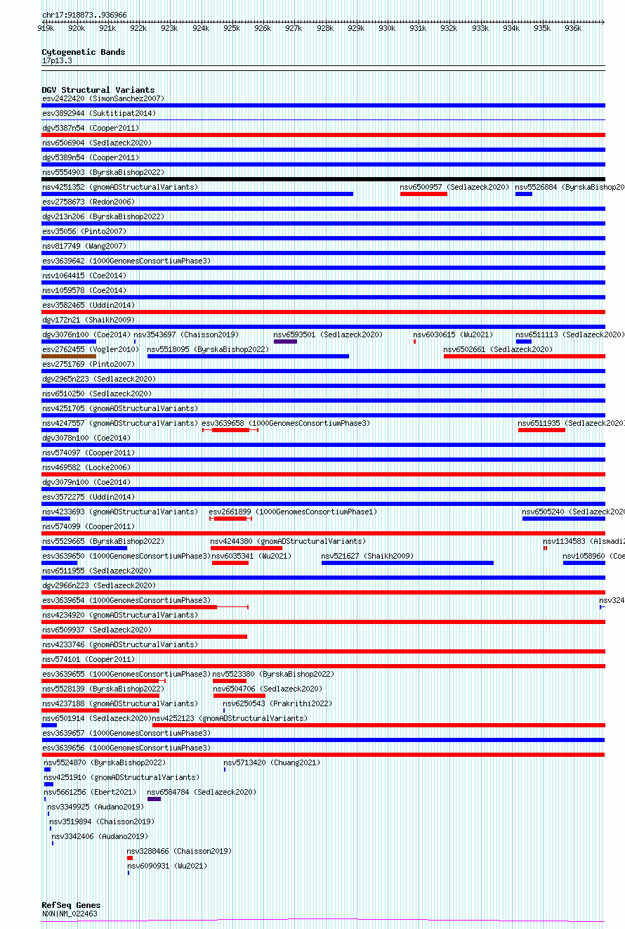 Variant DetailsVariant: esv3639657| Internal ID | 7026435 | | Landmark | | | Location Information | | | Cytoband | 17p13.3 | | Allele length | | Assembly | Allele length | | hg38 | 18094 | | hg19 | 18094 |