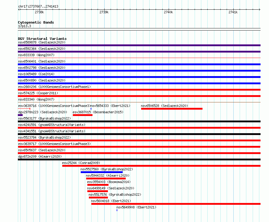 Variant DetailsVariant: esv3639717| Internal ID | 7026495 | | Landmark | | | Location Information | | | Cytoband | 17p13.3 | | Allele length | | Assembly | Allele length | | hg38 | 3747 | | hg19 | 3747 |