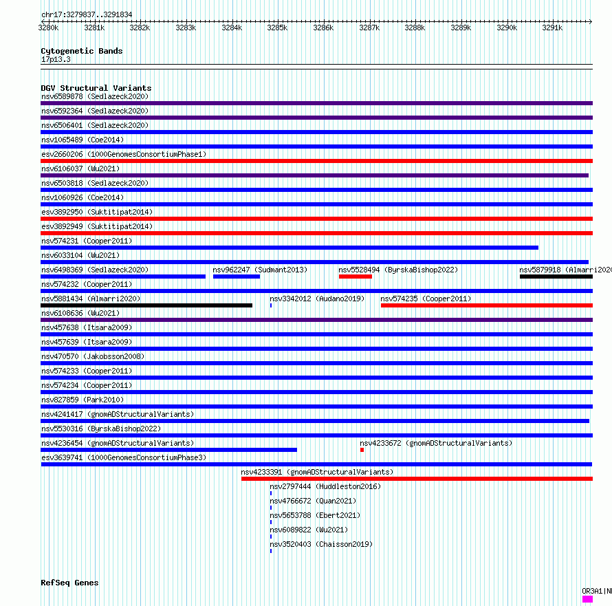 Variant DetailsVariant: esv3639741| Internal ID | 7026519 | | Landmark | | | Location Information | | | Cytoband | 17p13.3 | | Allele length | | Assembly | Allele length | | hg38 | 11998 | | hg19 | 11998 |