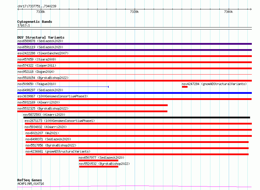 Variant DetailsVariant: esv3639867| Internal ID | 7026645 | | Landmark | | | Location Information | | | Cytoband | 17p13.1 | | Allele length | | Assembly | Allele length | | hg38 | 2489 | | hg19 | 2489 |