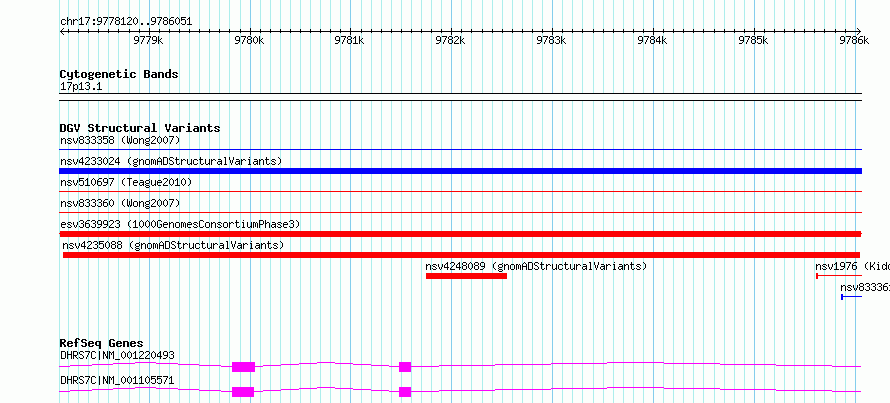 | Variant Type | CNV loss | Copy Number | | Allele State | | Allele Origin | | Probe Count | | Validation Flag | | Merged Status | M | Merged Variants | | Supporting Variants | essv15610365, essv15610371, essv15610372, essv15610370, essv15610363, essv15610366, essv15610367, essv15610362, essv15610364, essv15610369, essv15610368 | Samples | HG00766, HG00452, HG02087, HG02166, HG02084, HG01029, HG02408, HG01028, HG01817, HG01872, HG02406 | Known Genes | DHRS7C | Method | Sequencing | Analysis | | Platform | Multiple platforms | Comments | | Reference | 1000_Genomes_Consortium_Phase_3 | Pubmed ID | 21293372 | Accession Number(s) | esv3639923
