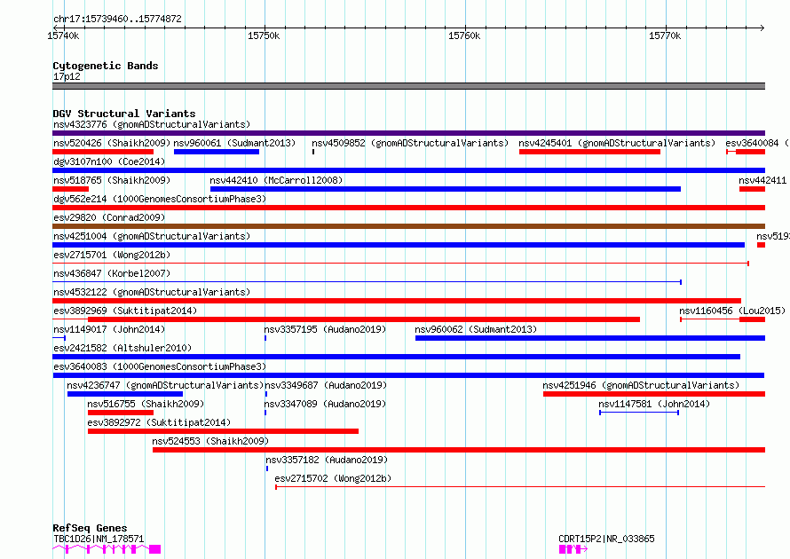 Variant DetailsVariant: esv3640082| Internal ID | 6680172 | | Landmark | | | Location Information | | | Cytoband | 17p12 | | Allele length | | Assembly | Allele length | | hg38 | 35413 | | hg19 | 35413 |