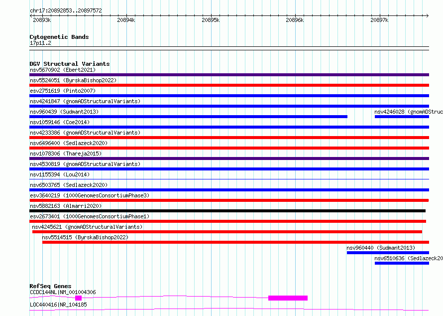 Variant DetailsVariant: esv3640219| Internal ID | 7026994 | | Landmark | | | Location Information | | | Cytoband | 17p11.2 | | Allele length | | Assembly | Allele length | | hg38 | 4720 | | hg19 | 4720 |