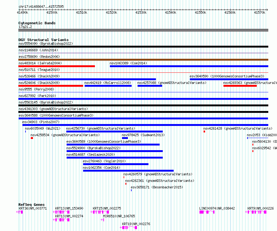 Variant DetailsVariant: esv3640588| Internal ID | 7027363 | | Landmark | | | Location Information | | | Cytoband | 17q21.2 | | Allele length | | Assembly | Allele length | | hg38 | 83949 | | hg19 | 83949 |