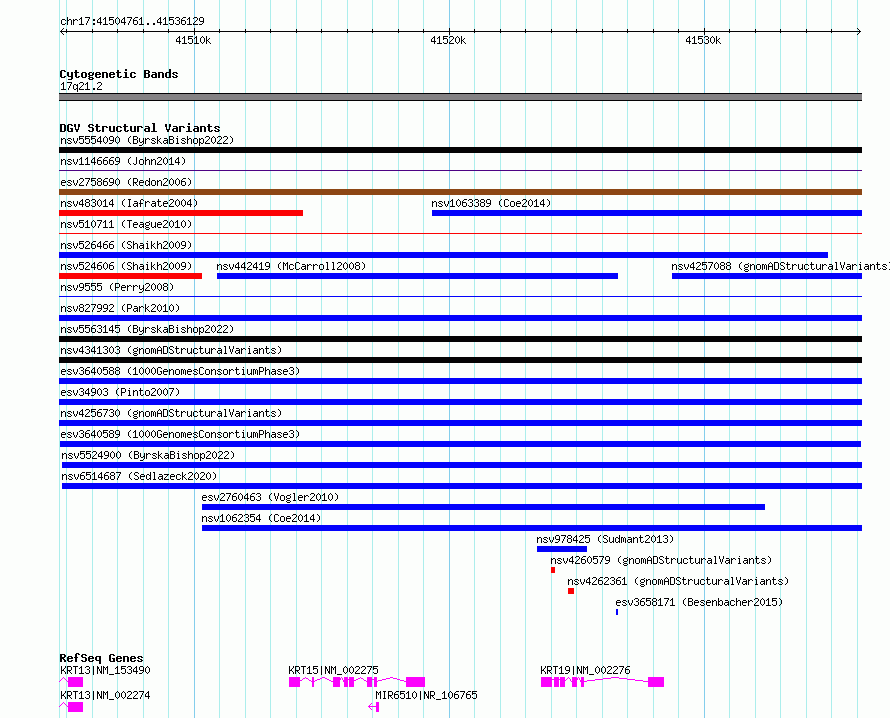 Variant DetailsVariant: esv3640589| Internal ID | 7027364 | | Landmark | | | Location Information | | | Cytoband | 17q21.2 | | Allele length | | Assembly | Allele length | | hg38 | 31369 | | hg19 | 31369 |
