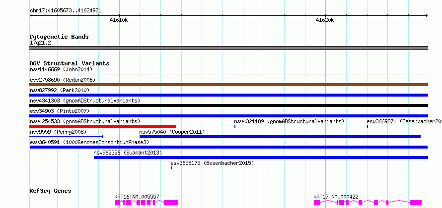 | Variant Type | CNV gain | Copy Number | | Allele State | | Allele Origin | | Probe Count | | Validation Flag | | Merged Status | M | Merged Variants | | Supporting Variants | essv15679022 | Samples | NA18564 | Known Genes | KRT16, KRT17 | Method | Sequencing | Analysis | | Platform | Multiple platforms | Comments | | Reference | 1000_Genomes_Consortium_Phase_3 | Pubmed ID | 21293372 | Accession Number(s) | esv3640591