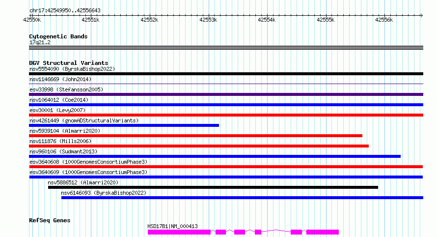 Variant DetailsVariant: esv3640608| Internal ID | 7027383 | | Landmark | | | Location Information | | | Cytoband | 17q21.2 | | Allele length | | Assembly | Allele length | | hg38 | 6694 | | hg19 | 6694 |
