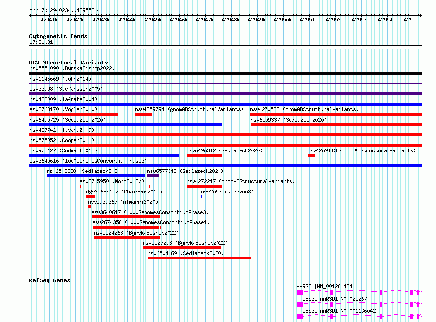 Variant DetailsVariant: esv3640616| Internal ID | 7027391 | | Landmark | | | Location Information | | | Cytoband | 17q21.31 | | Allele length | | Assembly | Allele length | | hg38 | 15081 | | hg19 | 15081 |