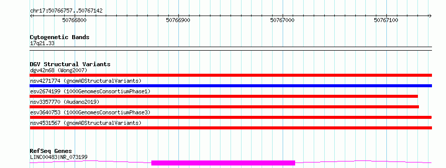 Variant DetailsVariant: esv3640753 Internal ID | 6680839 | Landmark | | Location Information | | Cytoband | 17q21.33 | Allele length | Assembly | Allele length | hg38 | 386 | hg19 | 386 |