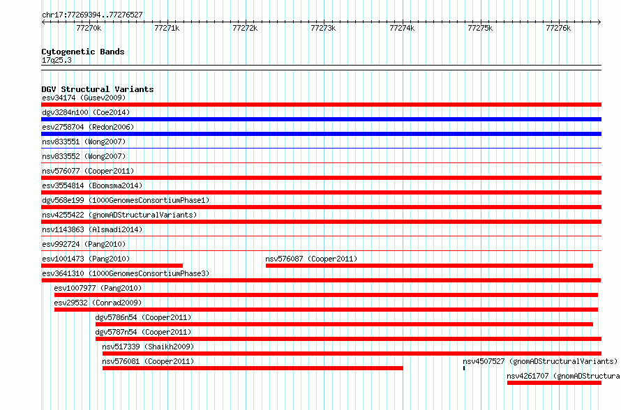 Variant DetailsVariant: esv3641310 Internal ID | 6681395 | Landmark | | Location Information | | Cytoband | 17q25.2 | Allele length | Assembly | Allele length | hg38 | 7134 | hg19 | 7134 |