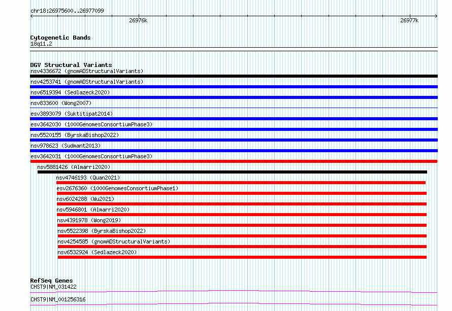 | | Variant Type | CNV loss | | Copy Number | | | Allele State | | | Allele Origin | | | Probe Count | | | Validation Flag | | | Merged Status | M | | Merged Variants | | | Supporting Variants | essv15824579, essv15824557, essv15824586, essv15824595, essv15824592, essv15824589, essv15824576, essv15824580, essv15824567, essv15824575, essv15824561, essv15824571, essv15824565, essv15824597, essv15824588, essv15824573, essv15824578, essv15824568, essv15824562, essv15824587, essv15824558, essv15824577, essv15824596, essv15824594, essv15824570, essv15824559, essv15824566, essv15824574, essv15824563, essv15824560, essv15824582, essv15824584, essv15824569, essv15824581, essv15824593, essv15824598, essv15824590, essv15824556, essv15824583, essv15824572, essv15824585, essv15824591, essv15824564 | | Samples | HG00442, HG02072, HG01965, HG00699, HG01802, HG00654, HG00663, NA18563, NA19678, NA18558, HG00610, HG01982, HG01893, NA18749, HG02395, HG02138, NA18954, HG02402, NA18605, HG02075, HG02345, HG02057, HG00653, HG02084, HG00556, HG00583, HG01414, HG00651, HG00690, NA18536, NA18593, NA18546, HG02064, HG01260, NA18643, NA19783, HG02116, NA19770, NA19780, NA18989, NA18623, HG01923, HG01926 | | Known Genes | CHST9 | | Method | Sequencing | | Analysis | | | Platform | Multiple platforms | | Comments | | | Reference | 1000_Genomes_Consortium_Phase_3 | | Pubmed ID | 21293372 | | Accession Number(s) | esv3642031