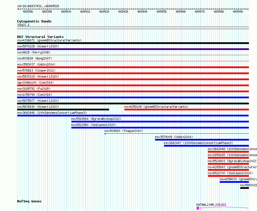 Variant DetailsVariant: esv3642446| Internal ID | 7029216 | | Landmark | | | Location Information | | | Cytoband | 18q21.1 | | Allele length | | Assembly | Allele length | | hg38 | 12098 | | hg19 | 12098 |