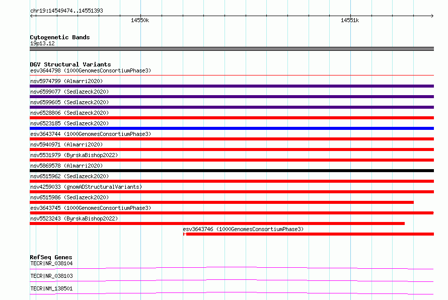 Variant DetailsVariant: esv3643745 | Internal ID | 7030503 | | Landmark | | | Location Information | | | Cytoband | 19p13.12 | | Allele length | | Assembly | Allele length | | hg38 | 1920 | | hg19 | 1920 |