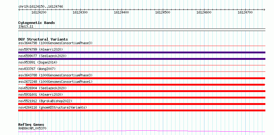 Variant DetailsVariant: esv3643788| Internal ID | 7030546 | | Landmark | | | Location Information | | | Cytoband | 19p13.12 | | Allele length | | Assembly | Allele length | | hg38 | 597 | | hg19 | 597 |