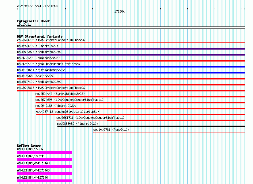 Variant DetailsVariant: esv3643816 | Internal ID | 7030573 | | Landmark | | | Location Information | | | Cytoband | 19p13.11 | | Allele length | | Assembly | Allele length | | hg38 | 1677 | | hg19 | 1677 |