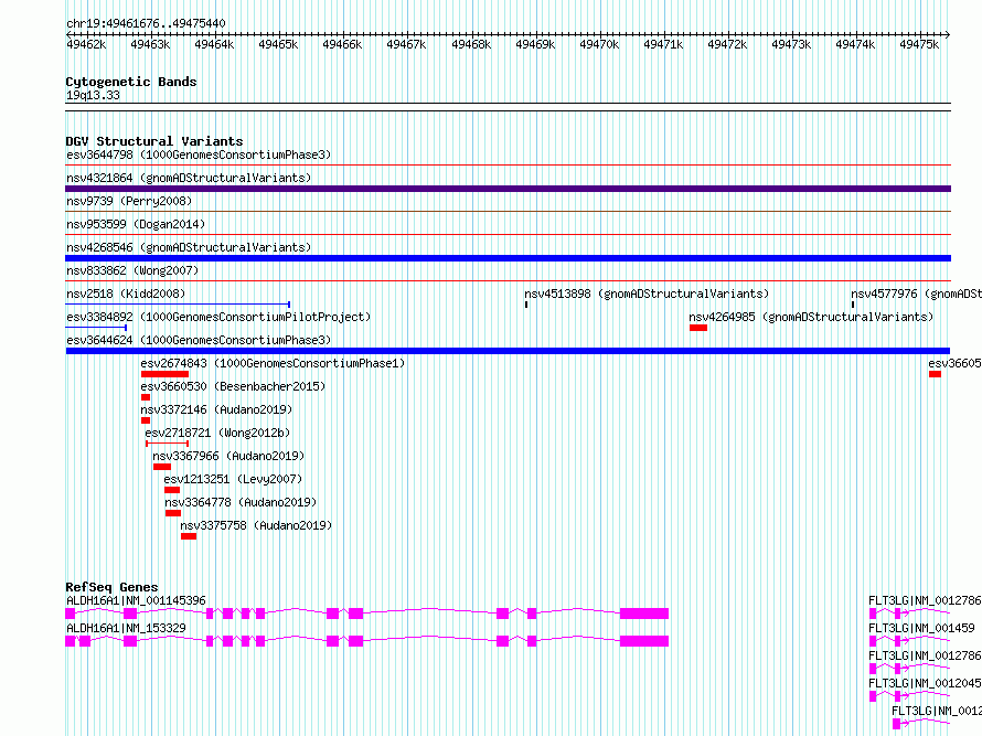 Variant DetailsVariant: esv3644624| Internal ID | 6684690 | | Landmark | | | Location Information | | | Cytoband | 19q13.33 | | Allele length | | Assembly | Allele length | | hg38 | 13765 | | hg19 | 13765 |