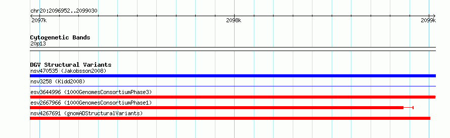 Variant DetailsVariant: esv3644996| Internal ID | 6685059 | | Landmark | | | Location Information | | | Cytoband | 20p13 | | Allele length | | Assembly | Allele length | | hg38 | 2079 | | hg19 | 2079 |