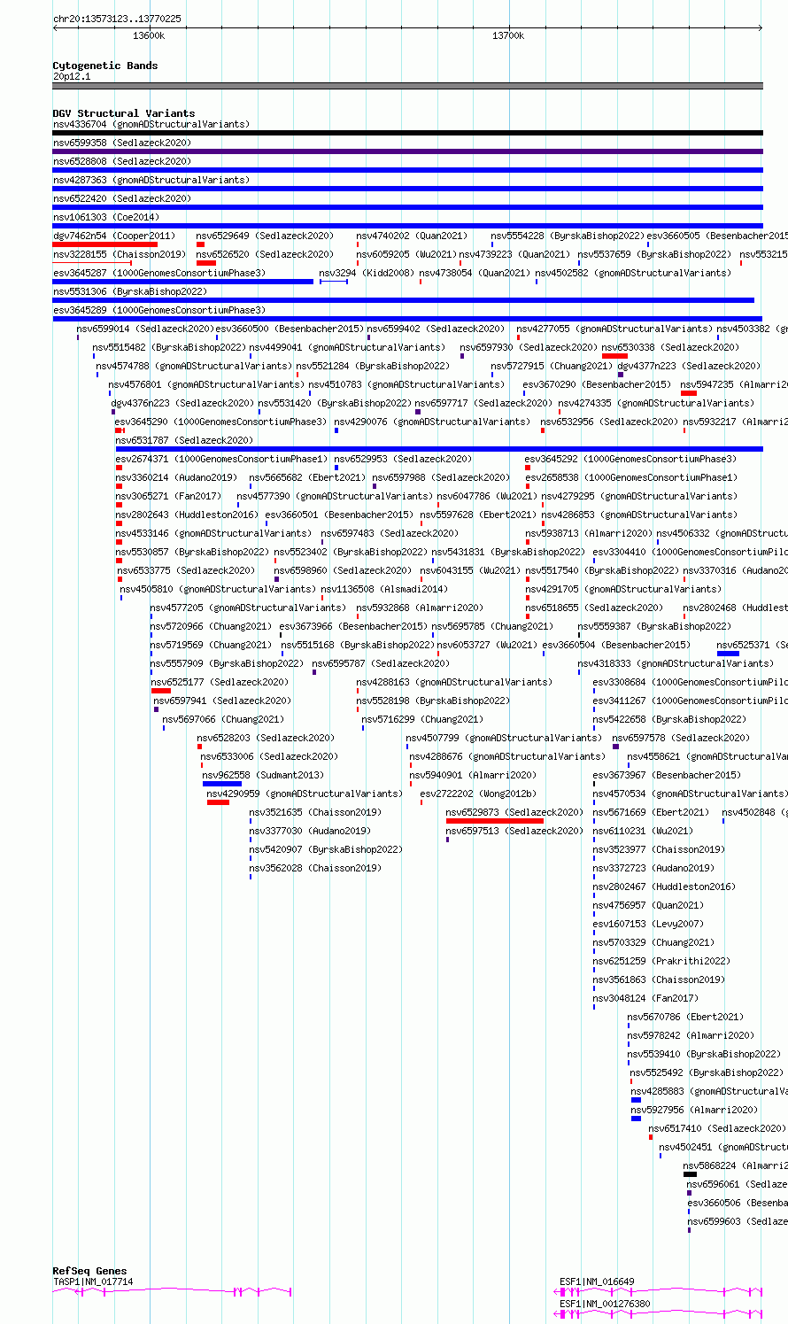 Variant DetailsVariant: esv3645289| Internal ID | 7032039 | | Landmark | | | Location Information | | | Cytoband | 20p12.1 | | Allele length | | Assembly | Allele length | | hg38 | 197103 | | hg19 | 197102 |