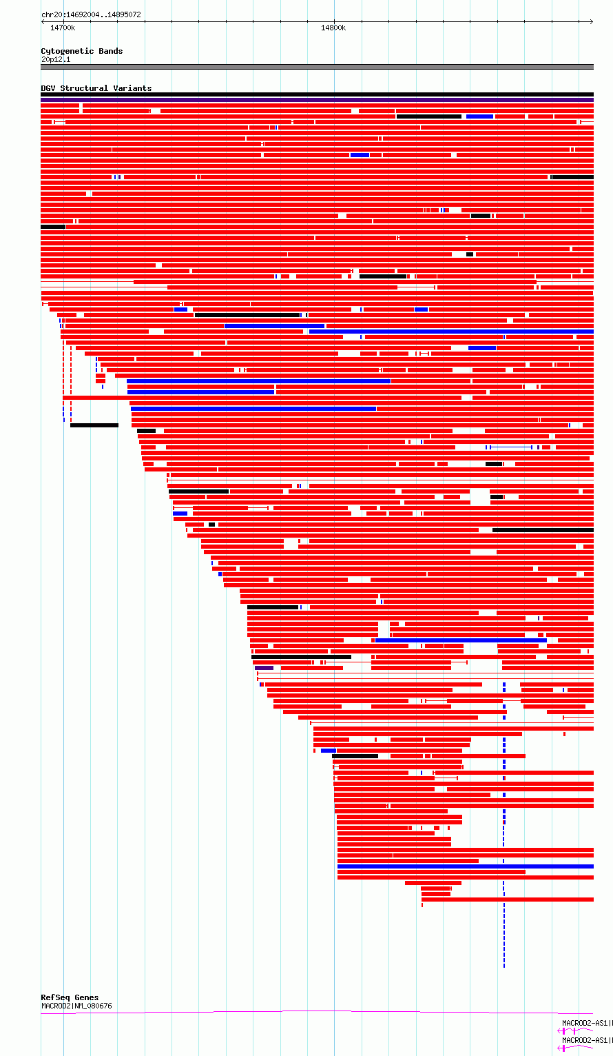 | | Variant Type | CNV loss | | Copy Number | | | Allele State | | | Allele Origin | | | Probe Count | | | Validation Flag | | | Merged Status | M | | Merged Variants | | | Supporting Variants | essv16144529, essv16144533, essv16144531, essv16144532, essv16144530 | | Samples | NA20846, NA21105, NA20767, NA20897, NA18876 | | Known Genes | MACROD2, MACROD2-AS1 | | Method | Sequencing | | Analysis | | | Platform | Multiple platforms | | Comments | | | Reference | 1000_Genomes_Consortium_Phase_3 | | Pubmed ID | 21293372 | | Accession Number(s) | esv3645326