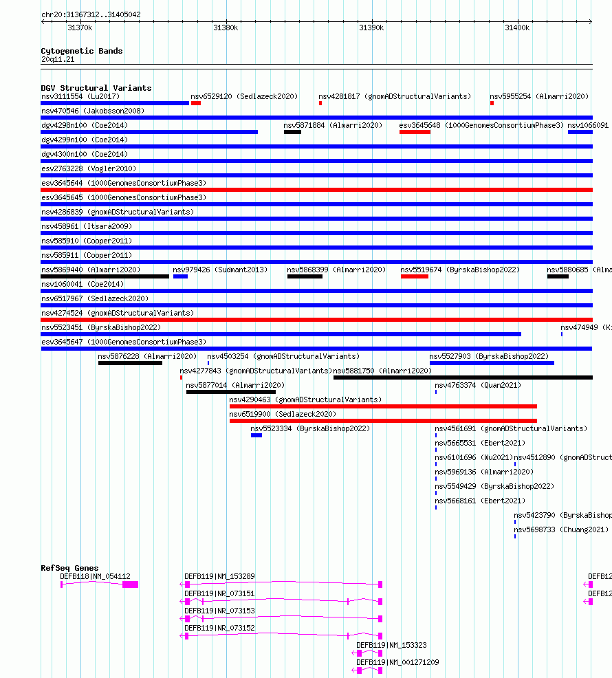 Variant DetailsVariant: esv3645647| Internal ID | 7032396 | | Landmark | | | Location Information | | | Cytoband | 20q11.21 | | Allele length | | Assembly | Allele length | | hg38 | 37731 | | hg19 | 37731 |