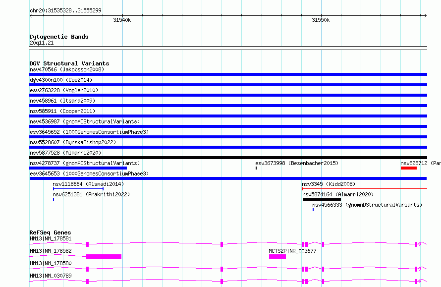 Variant DetailsVariant: esv3645653| Internal ID | 7032402 | | Landmark | | | Location Information | | | Cytoband | 20q11.21 | | Allele length | | Assembly | Allele length | | hg38 | 19972 | | hg19 | 19972 |