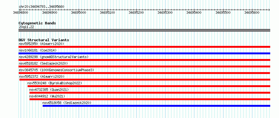 Variant DetailsVariant: esv3645705| Internal ID | 7032454 | | Landmark | | | Location Information | | | Cytoband | 20q11.22 | | Allele length | | Assembly | Allele length | | hg38 | 868 | | hg19 | 868 |