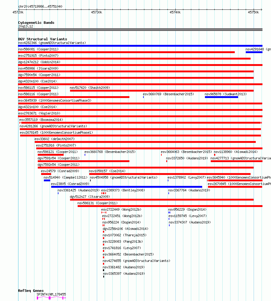 | Variant Type | CNV loss | Copy Number | | Allele State | | Allele Origin | | Probe Count | | Validation Flag | | Merged Status | M | Merged Variants | | Supporting Variants | essv16196478, essv16196482, essv16196479, essv16196484, essv16196481, essv16196476, essv16196480, essv16196483, essv16196477 | Samples | HG00261, HG00251, NA12275, HG02332, HG00376, HG00119, HG00136, HG00329, NA20511 | Known Genes | SPINT4 | Method | Sequencing | Analysis | | Platform | Multiple platforms | Comments | | Reference | 1000_Genomes_Consortium_Phase_3 | Pubmed ID | 21293372 | Accession Number(s) | esv3645939