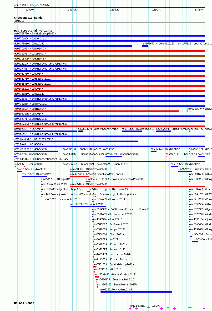 Variant DetailsVariant: esv3646414| Internal ID | 7033158 | | Landmark | | | Location Information | | | Cytoband | 21q11.2 | | Allele length | | Assembly | Allele length | | hg38 | 45119 | | hg19 | 45119 |