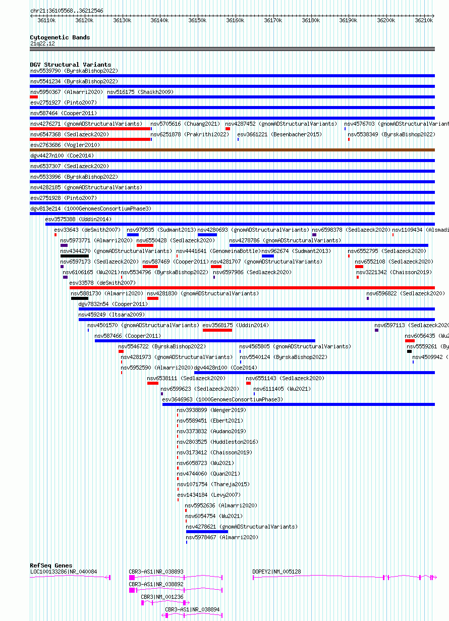 | | Variant Type | CNV gain | | Copy Number | | | Allele State | | | Allele Origin | | | Probe Count | | | Validation Flag | | | Merged Status | M | | Merged Variants | dgv813e214 | | Supporting Variants | essv16319372, essv16319370, essv16319368, essv16319369, essv16319371 | | Samples | HG02277, HG00356, HG00349, HG00366, HG02133 | | Known Genes | CBR3, CBR3-AS1, DOPEY2, LOC100133286 | | Method | Sequencing | | Analysis | | | Platform | Multiple platforms | | Comments | | | Reference | 1000_Genomes_Consortium_Phase_3 | | Pubmed ID | 21293372 | | Accession Number(s) | esv3646962