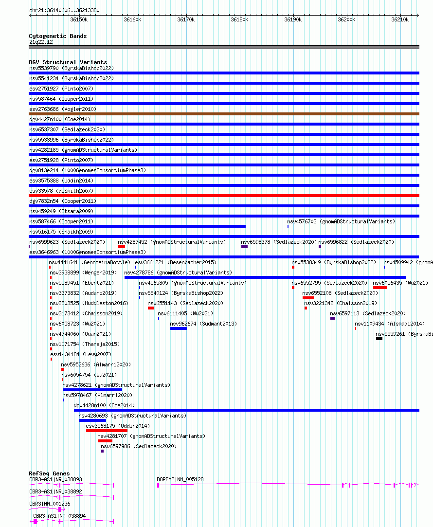 | | Variant Type | CNV gain | | Copy Number | | | Allele State | | | Allele Origin | | | Probe Count | | | Validation Flag | | | Merged Status | M | | Merged Variants | | | Supporting Variants | essv16319373 | | Samples | HG02277 | | Known Genes | CBR3, CBR3-AS1, DOPEY2 | | Method | Sequencing | | Analysis | | | Platform | Multiple platforms | | Comments | | | Reference | 1000_Genomes_Consortium_Phase_3 | | Pubmed ID | 21293372 | | Accession Number(s) | esv3646963