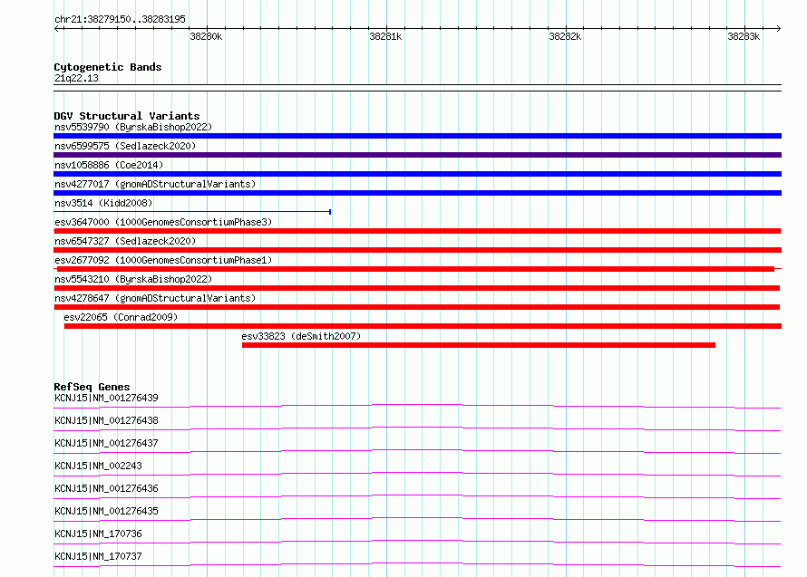 Variant DetailsVariant: esv3647000| Internal ID | 7033742 | | Landmark | | | Location Information | | | Cytoband | 21q22.13 | | Allele length | | Assembly | Allele length | | hg38 | 4046 | | hg19 | 4046 |