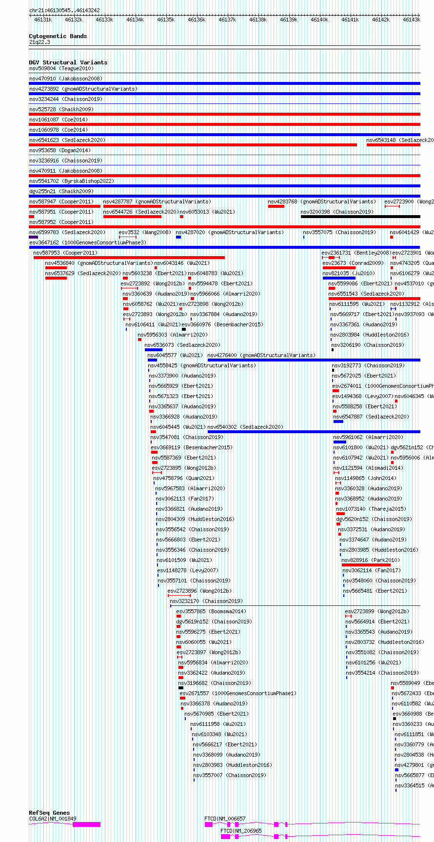 | | Variant Type | CNV gain | | Copy Number | | | Allele State | | | Allele Origin | | | Probe Count | | | Validation Flag | | | Merged Status | M | | Merged Variants | | | Supporting Variants | essv16345326, essv16345327 | | Samples | HG03241, NA19438 | | Known Genes | COL6A2, FTCD | | Method | Sequencing | | Analysis | | | Platform | Multiple platforms | | Comments | | | Reference | 1000_Genomes_Consortium_Phase_3 | | Pubmed ID | 21293372 | | Accession Number(s) | esv3647162