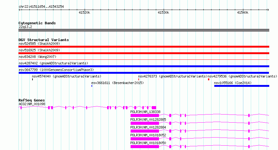 | Variant Type | CNV gain | Copy Number | | Allele State | | Allele Origin | | Probe Count | | Validation Flag | | Merged Status | M | Merged Variants | | Supporting Variants | essv16430129 | Samples | NA19984 | Known Genes | ACO2, POLR3H | Method | Sequencing | Analysis | | Platform | Multiple platforms | Comments | | Reference | 1000_Genomes_Consortium_Phase_3 | Pubmed ID | 21293372 | Accession Number(s) | esv3647799