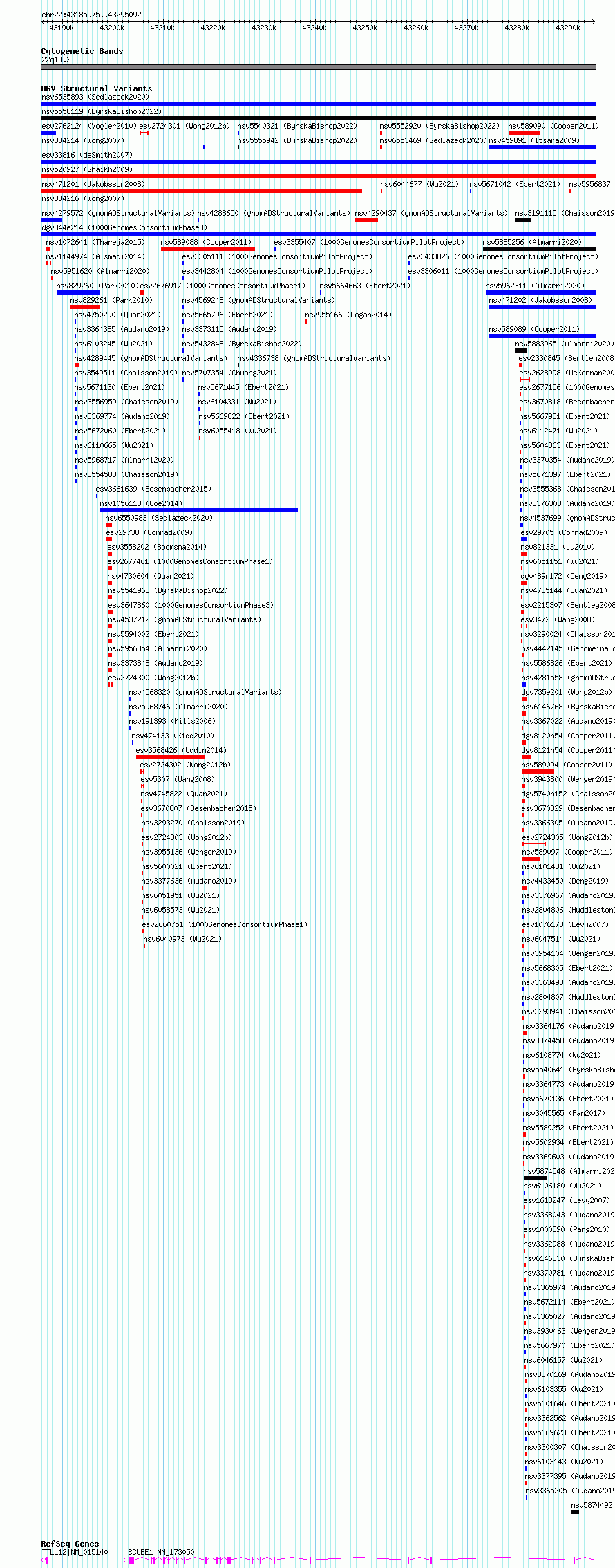 Variant DetailsVariant: esv3647859| Internal ID | 7034598 | | Landmark | | | Location Information | | | Cytoband | 22q13.2 | | Allele length | | Assembly | Allele length | | hg38 | 109118 | | hg19 | 109118 |