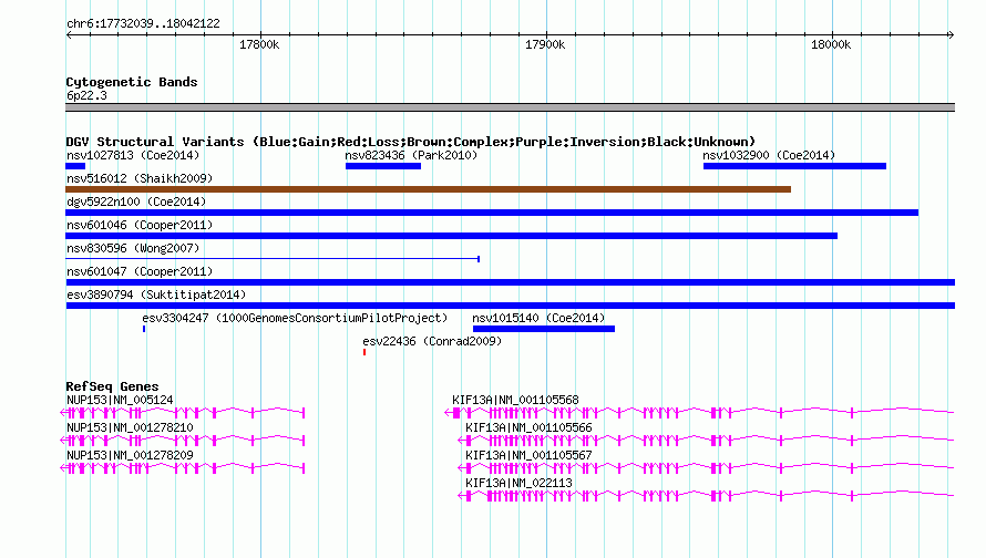 | Variant Type | CNV gain | Copy Number | | Allele State | | Allele Origin | | Probe Count | | Validation Flag | | Merged Status | M | Merged Variants | | Supporting Variants | essv25789098 | Samples | | Known Genes | KIF13A, NUP153 | Method | SNP array | Analysis | | Platform | Illumina HumanHap 610 | Comments | | Reference | Suktitipat_et_al_2014 | Pubmed ID | 25118596 | Accession Number(s) | esv3890794