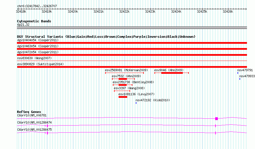 Variant DetailsVariant: esv3890829| Internal ID | 19185131 | | Landmark | | | Location Information | | | Cytoband | 6p21.32 | | Allele length | | Assembly | Allele length | | hg38 | 8866 | | hg19 | 8866 | | hg18 | 8866 |