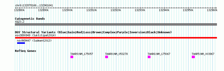 | | Variant Type | CNV loss | | Copy Number | | | Allele State | | | Allele Origin | | | Probe Count | | | Validation Flag | | | Merged Status | M | | Merged Variants | | | Supporting Variants | essv25799012 | | Samples | | | Known Genes | TAAR5, TAAR6, TAAR8, TAAR9 | | Method | SNP array | | Analysis | | | Platform | Illumina HumanHap 610 | | Comments | | | Reference | Suktitipat_et_al_2014 | | Pubmed ID | 25118596 | | Accession Number(s) | esv3890949