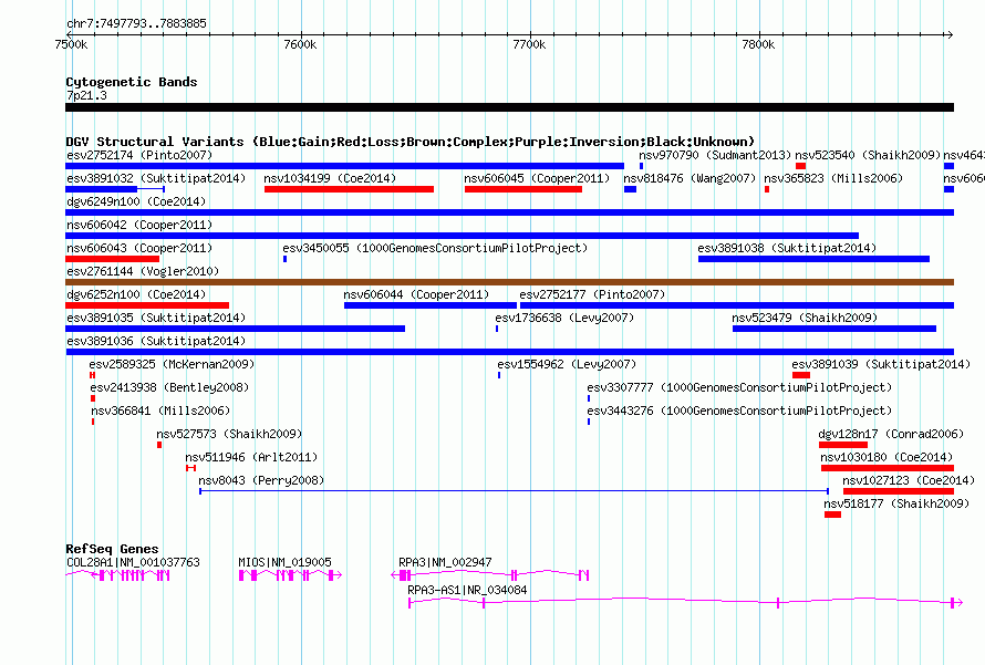 | | Variant Type | CNV gain | | Copy Number | | | Allele State | | | Allele Origin | | | Probe Count | | | Validation Flag | | | Merged Status | M | | Merged Variants | | | Supporting Variants | essv25790988 | | Samples | | | Known Genes | COL28A1, MIOS, RPA3, RPA3-AS1 | | Method | SNP array | | Analysis | | | Platform | Illumina HumanHap 610 | | Comments | | | Reference | Suktitipat_et_al_2014 | | Pubmed ID | 25118596 | | Accession Number(s) | esv3891036