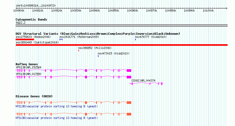 | Variant Type | CNV loss | Copy Number | | Allele State | | Allele Origin | | Probe Count | | Validation Flag | | Merged Status | M | Merged Variants | | Supporting Variants | essv25785848 | Samples | | Known Genes | COX6C, VPS13B | Method | SNP array | Analysis | | Platform | Illumina HumanHap 610 | Comments | | Reference | Suktitipat_et_al_2014 | Pubmed ID | 25118596 | Accession Number(s) | esv3891449