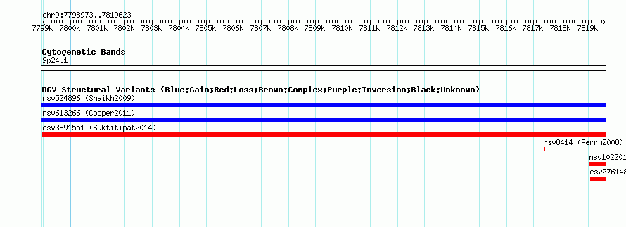 Variant DetailsVariant: esv3891551| Internal ID | 19185947 | | Landmark | | | Location Information | | | Cytoband | 9p24.1 | | Allele length | | Assembly | Allele length | | hg38 | 20651 | | hg19 | 20651 | | hg18 | 20651 |