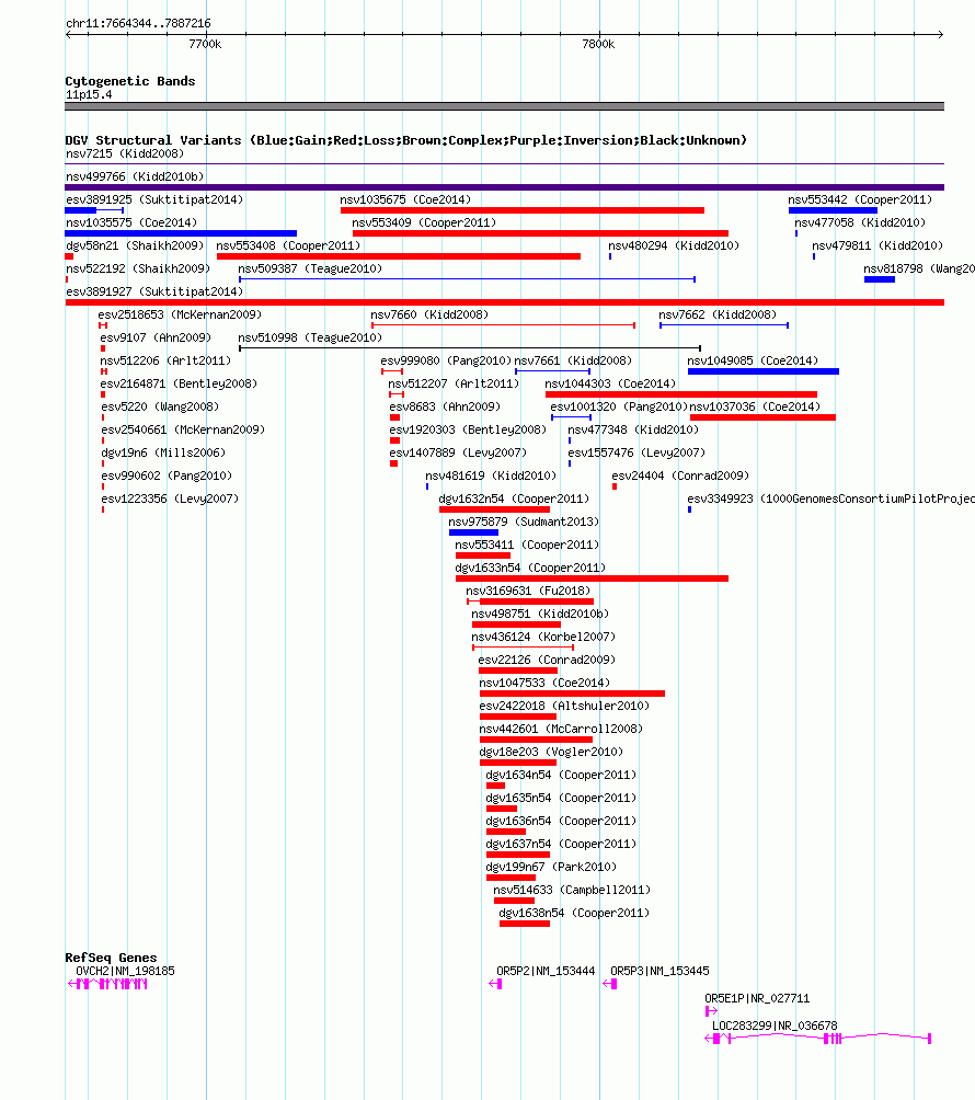 Variant DetailsVariant: esv3891927| Internal ID | 19186323 | | Landmark | | | Location Information | | | Cytoband | 11p15.4 | | Allele length | | Assembly | Allele length | | hg38 | 222557 | | hg19 | 222873 | | hg18 | 222873 |