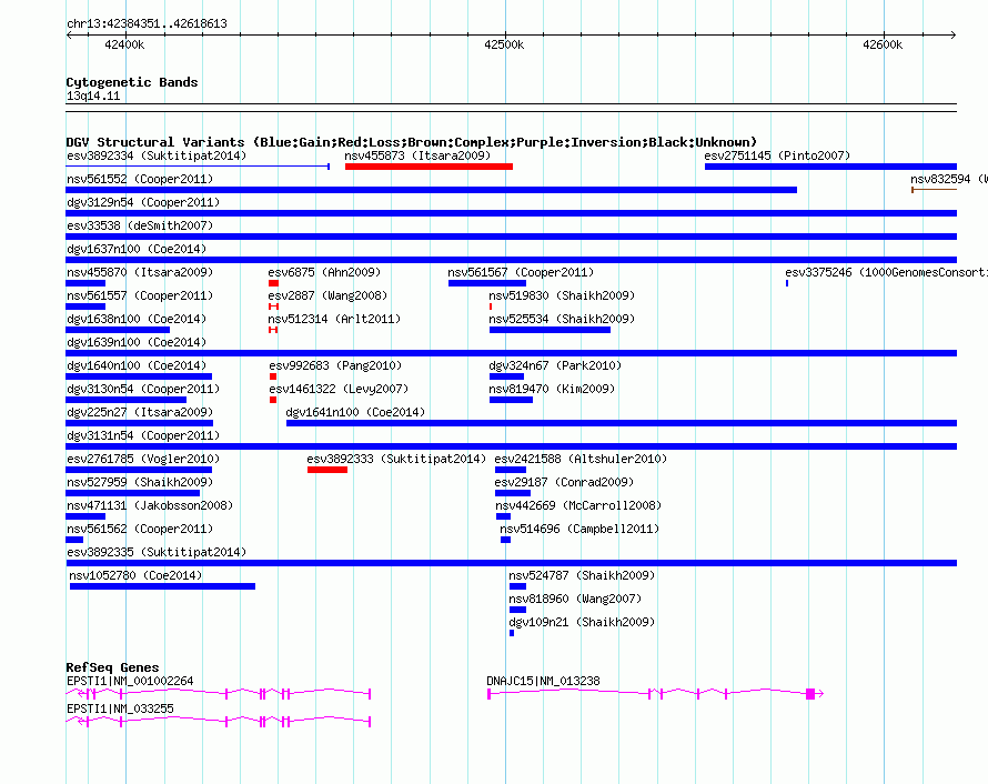 Variant DetailsVariant: esv3892335| Internal ID | 18836469 | | Landmark | | | Location Information | | | Cytoband | 13q14.11 | | Allele length | | Assembly | Allele length | | hg38 | 234263 | | hg19 | 234263 | | hg18 | 234263 |