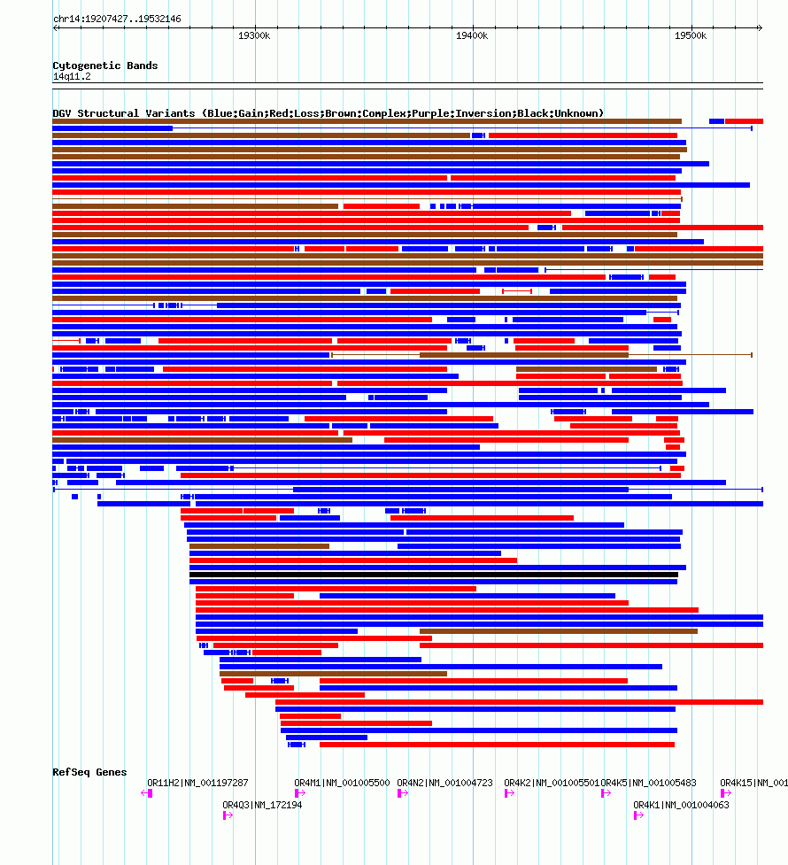 Variant DetailsVariant: esv3892451 | Internal ID | 19183271 | | Landmark | | | Location Information | | | Cytoband | 14q11.2 | | Allele length | | Assembly | Allele length | | hg38 | 324720 | | hg19 | 324720 | | hg18 | 324720 |