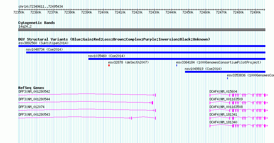 | | Variant Type | CNV gain | | Copy Number | | | Allele State | | | Allele Origin | | | Probe Count | | | Validation Flag | | | Merged Status | M | | Merged Variants | | | Supporting Variants | essv25788684 | | Samples | | | Known Genes | DCAF4, DPF3 | | Method | SNP array | | Analysis | | | Platform | Illumina HumanHap 610 | | Comments | | | Reference | Suktitipat_et_al_2014 | | Pubmed ID | 25118596 | | Accession Number(s) | esv3892560