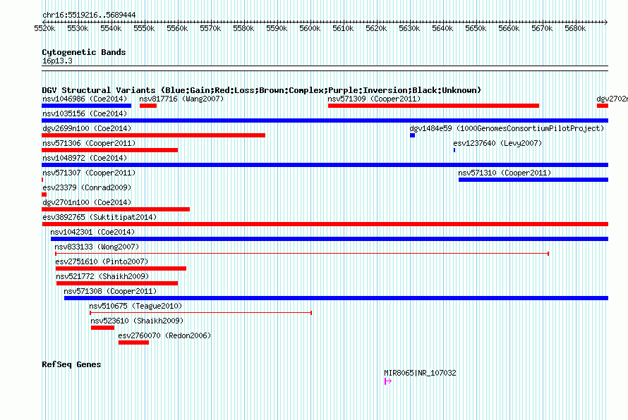 Variant DetailsVariant: esv3892765| Internal ID | 18836899 | | Landmark | | | Location Information | | | Cytoband | 16p13.3 | | Allele length | | Assembly | Allele length | | hg38 | 170229 | | hg19 | 170229 | | hg18 | 170229 |