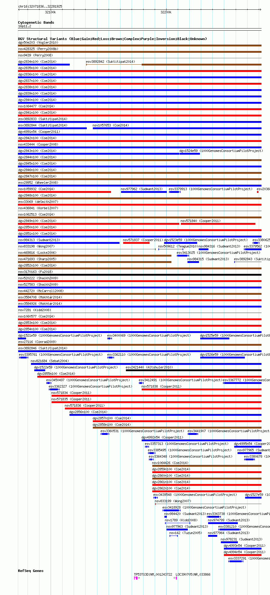 Variant DetailsVariant: esv3892846| Internal ID | 19183666 | | Landmark | | | Location Information | | | Cytoband | 16p11.2 | | Allele length | | Assembly | Allele length | | hg38 | 210090 | | hg19 | 210090 | | hg18 | 210090 |